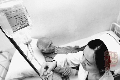 作为天津市养老院中的首家医保单位,和平区劲松护养院招聘了一批有资质的医生和护士,24小时值班。上图为该院医护人员在为病人输液。