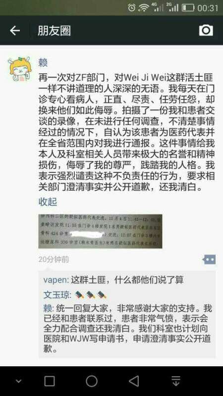 不过,事情曝光后,广东省人民医院一位被通报的当事医生赖水青在朋友圈中发布声明,她表示,当日自己是与患者在交流,却被相关部门拍下录像,且未经任何调查,不清楚事情经过,自以为患者是医药代表,遂在全省范围内对自己进行通报。