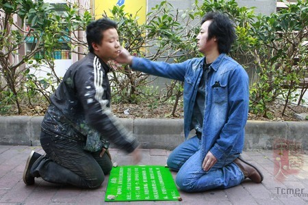 “希望用这种方式来唤醒人们对社会底层的关注!”据了解,从湖南来穗打工的阿飞在一个多月前发现自己脸部出现问题,但因经济拮据无法支付治疗面瘫的高昂医疗费。于是唐毅帮阿飞想了一个办法,通过互扇耳光的行为表演,唤起人们对当下普通劳动者看病贵、看病难等社会现象的关注。