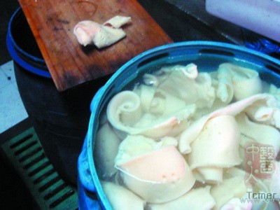 8日,哈尔滨市民何先生拨打本报新闻热线举报,道外区路南街棚户区内有一家加工毛肚、心管的黑作坊,生产环境十分恶劣。“这些毛肚、心管都是用火碱、双氧水浸泡的,每天产量都在上千斤。”9日至10日,记者通过暗访,追查到该黑作坊产品流向道里友谊市场。10日中午,道外区食安办、工商、质监部门依法查处了这个黑作坊,封存了近千斤的生产原料和成品。