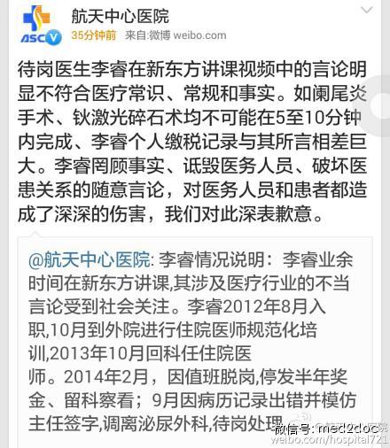 当天,李睿所属的北京航天中心医院官方微博发表了对李睿身份以及此事件的正式声明。称2014年2月,李睿因值班脱岗停发半年奖金、留科察看,同年9月因病历记录出错并模仿主任签字,调离泌尿外科,待岗处理。其在新东方讲课视频中的言论明显不符合医疗常识、常规和事实。其言行罔顾事实,是对医护人员的诋毁。