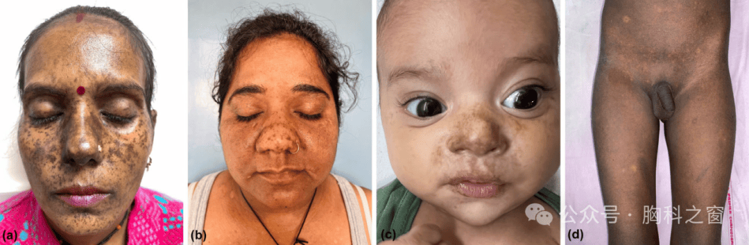 图2. 基孔肯雅热伴发的色素改变:(a)基孔征 —— 面部中央出现棕黑色雀斑样色素沉着;(b)鼻部出现基孔征,面部其余部位伴有弥漫性色素沉着;(c)棕鼻征 —— 鼻翼部位出现局限性灰黑色斑状色素沉着 ; (d)儿童出现全身性色素沉着。