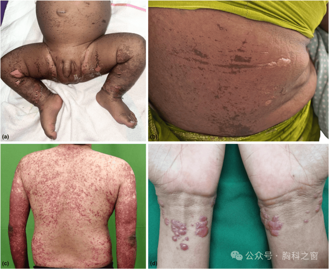 图4. 基孔肯雅热急性期的水疱大疱性及紫癜性皮疹(a)婴儿的水疱大疱性皮损,伴糜烂及紫癜性斑疹(b)躯干上的鞭状大疱性皮疹,此外还可见紫癜性斑疹(c)躯干及四肢广泛分布的靶样皮损,类似史蒂文 - 约翰逊综合征 / 中毒性表皮坏死松解症(d)腕部周围簇集的红斑性张力性大疱。组织病理学显示真皮上层水疱,伴由淋巴细胞、浆细胞及嗜酸性粒细胞组成的血管周围炎症。