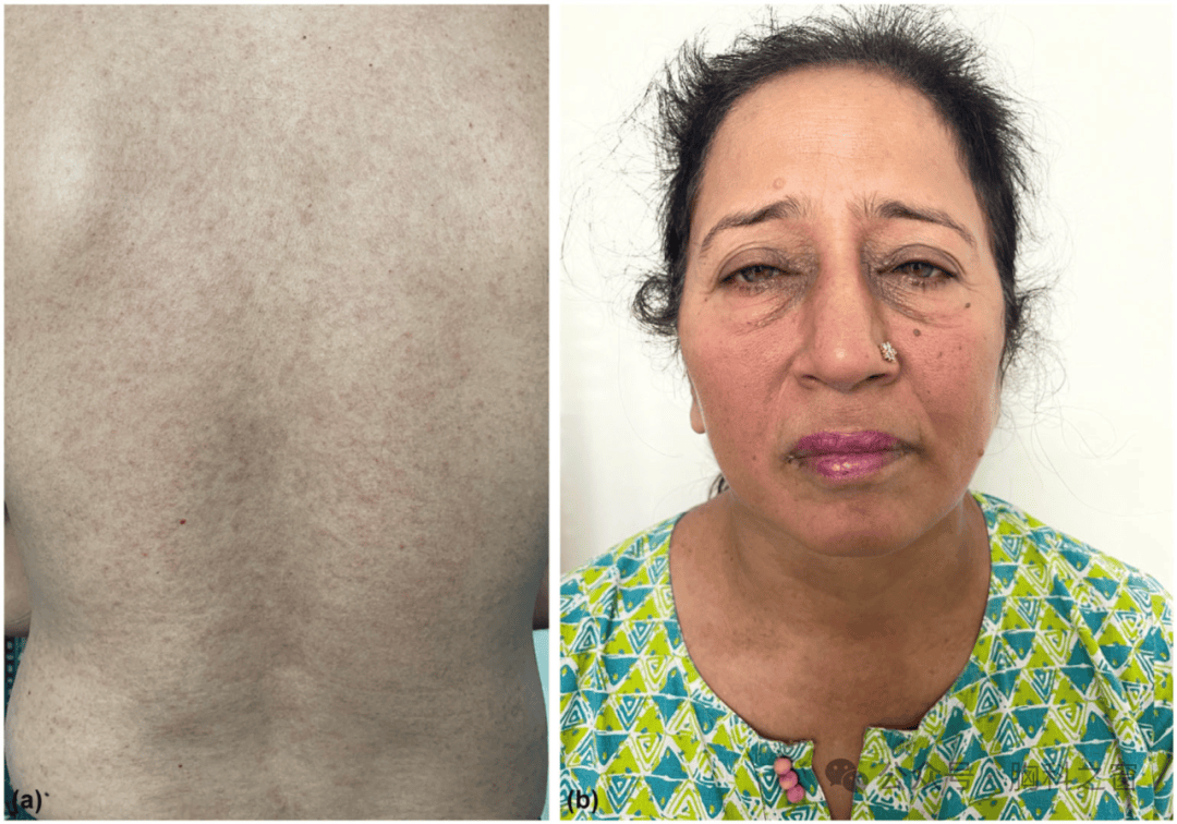 图3. 基孔肯雅热急性期斑丘疹 : a)累及躯干的斑丘疹(b)局限于面部的红斑。
