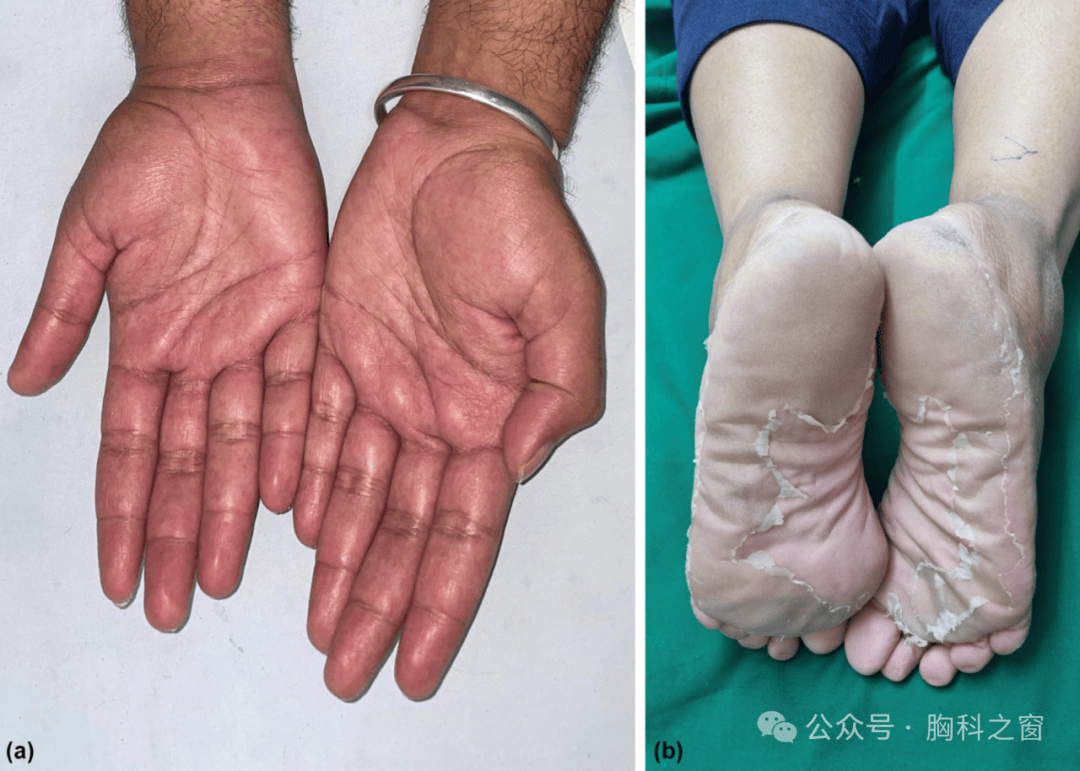 图5.(a)基孔肯雅热急性期表现之一的掌部红斑。(b)一名女性在基孔肯雅热发病 3 周后出现的足底脱屑。