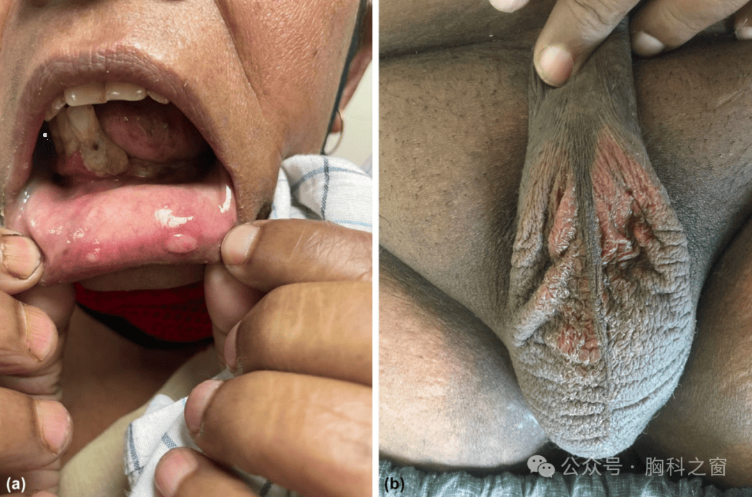 图6. (a) 基孔肯雅热急性期女性下唇出现阿弗他溃疡。(b) 基孔肯雅热急性期出现弥漫性阴囊红斑。