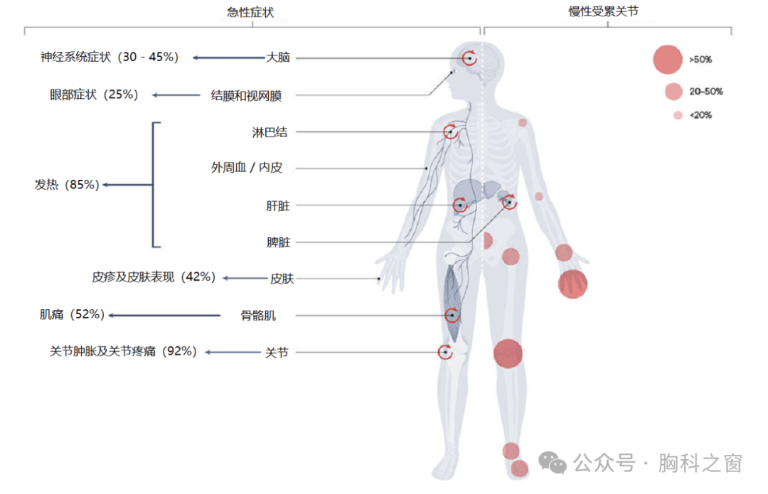 图7. 基孔肯雅病毒(CHIKV)会在周围器官进一步复制,包括淋巴结、脾脏,在重症病例中,还会累及肝脏、大脑及其他器官。急性症状多种多样,可出现在不同的器官和组织中,且发生率各不相同。在慢性期,关节往往会受到对称性影响,其中以周围关节的发生率最高。