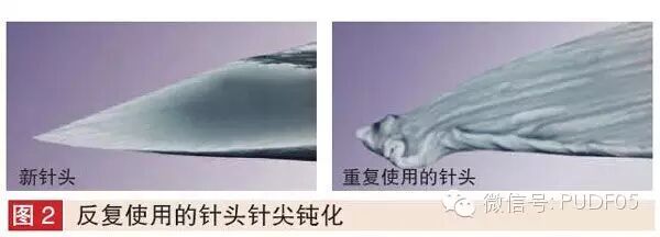 反复使用针头会造成五大弊端:①容易使空气(或其他污染物)进入笔芯;②会造成笔芯内药液泄漏;③针头中残留的药液会影响注射剂量的准确性,如果针头内残留的胰岛素形成结晶,会堵塞针头,妨碍注射;④注射笔用针头重复使用后,很容易造成针尖钝化(图2),⑤增加注射疼痛;针头重复使用还会导致皮下脂肪增生,血糖波动大,胰岛素用量增加,最终使治疗费用增加。