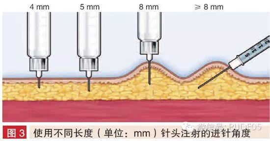 《指南》明确指出:“根据针头的长短正确判断是否需要捏皮以及注射的角度,规范掌握会对注射起到积极作用。使用较短(4 mm 或5 mm)针头时,大部分患者无需捏起皮肤,并可90°进针;使用较长(≥ 8 mm)针头时,需要捏皮和/ 或45°角进针以降低肌肉注射风险。”(图3)